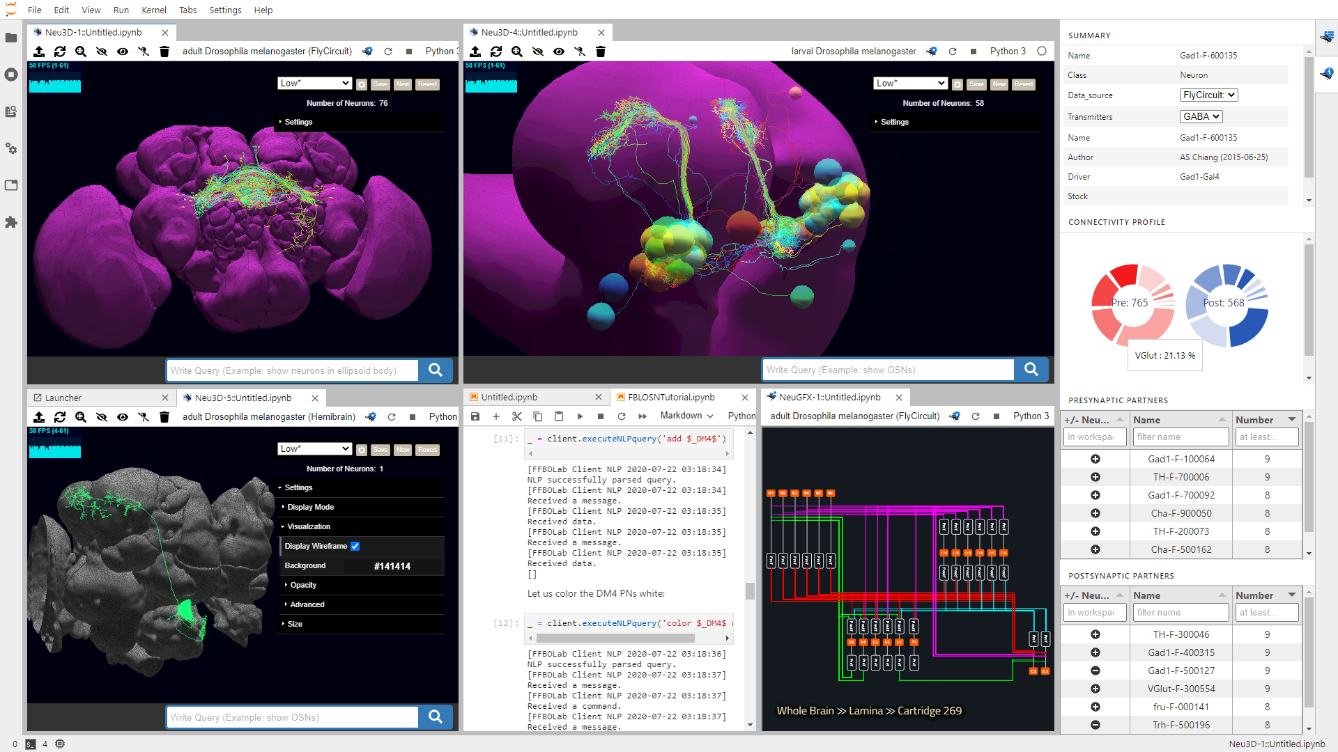 FlyBrainLab is a full-stack application, combining remote databases with local computing environments, all seamlessly integrated into a web-based UI. My primarily responsibility in developing the platform focuses on the frontend user interface, and building an extensible framework that supports communcations between: